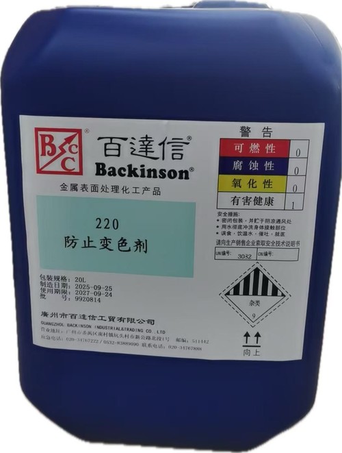 Anti-tarnish Agent No.220 is a clear, odorless, copolymerized acrylic, water based lacquer used over metal parts to yield a corrosion and scuff resistant finish. Since the material is water based, containing no solvents, it is non-flammable and produces no polluting fumes. Fire hazards are eliminated. The final finish is stable to light and heat and resists weathering and corrosion atmosphere.
